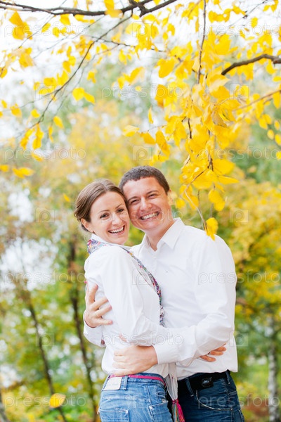 Молодая красивая пара на осенней прогулке