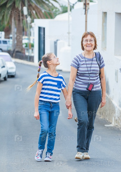 Счастливая девочка гуляет с бабушкой