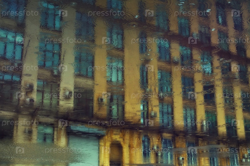 Отражение многоэтажного дома в луже с каплями дождя