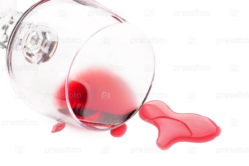 Красное вино, пролитое из стеклянного бокала на белом фоне