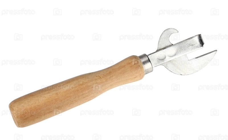 Металлический консервный нож с деревянной ручкой. Изолированный на белом фоне. Студийная съемка