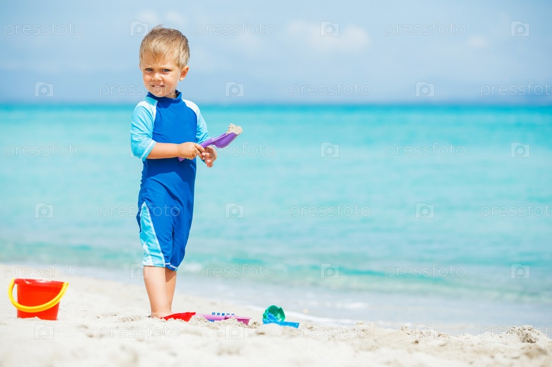 Мальчик играет с на пляже