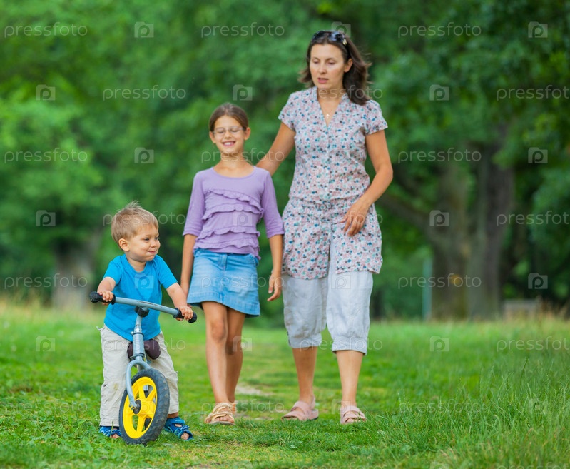 Маленький мальчик на велосипеде с семьей