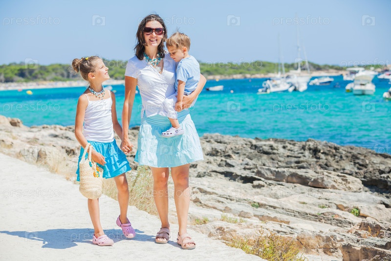 Семья из трех человек идет на тропическом пляже