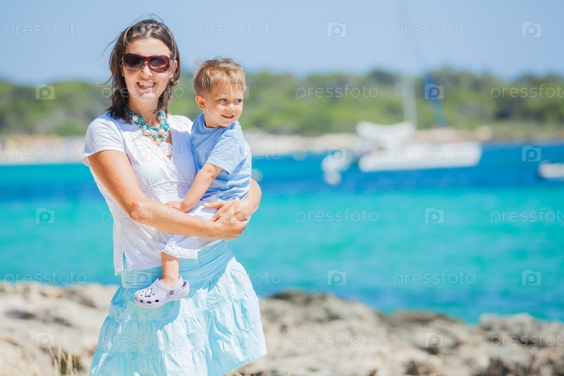 Семья идет на тропическом пляже