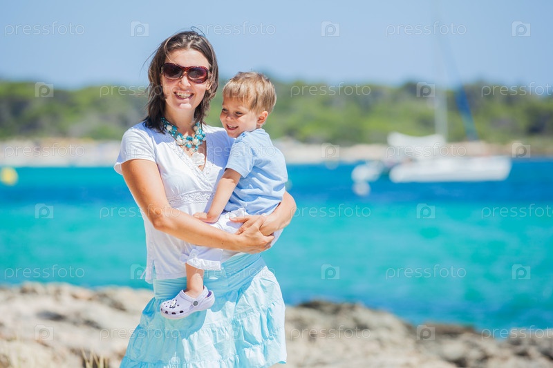 Семья идет на тропическом пляже
