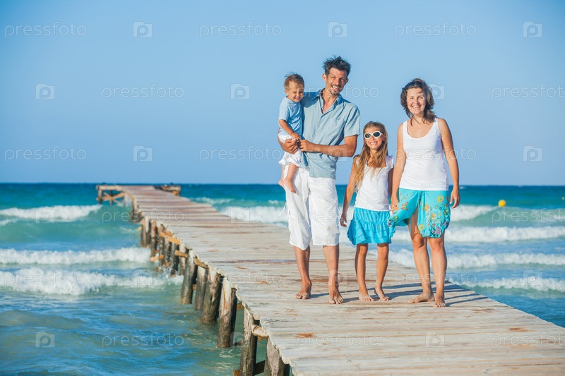 Семья на деревянной пристани на берегу океана