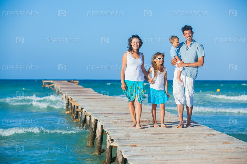 Семья на деревянной пристани на берегу океана