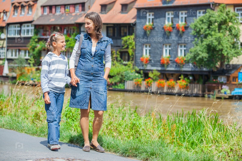 Мать с дочерью идут по улице