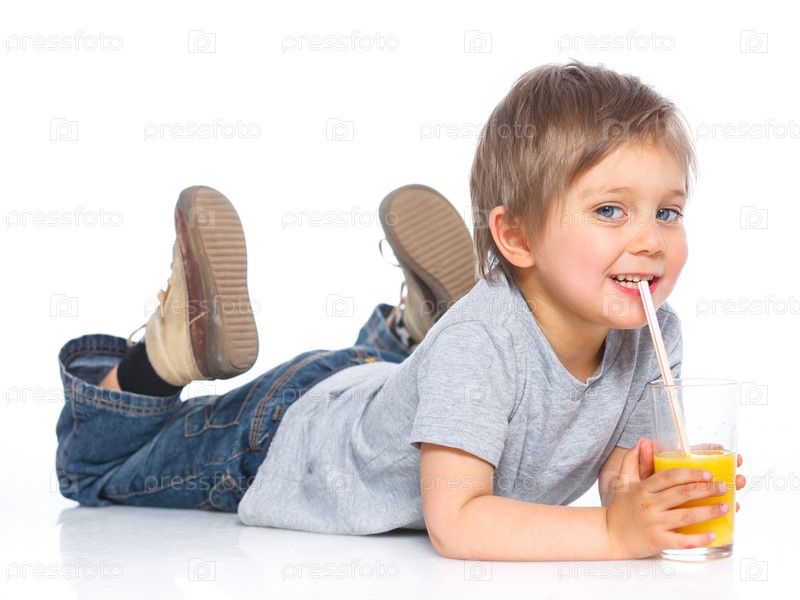 Маленький мальчик пьет апельсиновый сок
