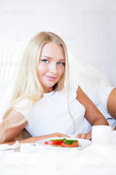 Красивая девушка завтракает в постели