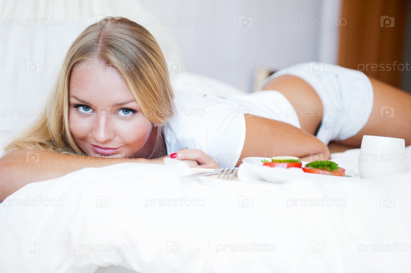 Красивая девушка завтракает в постели