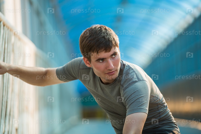 Мужчина делает растяжку на улице города