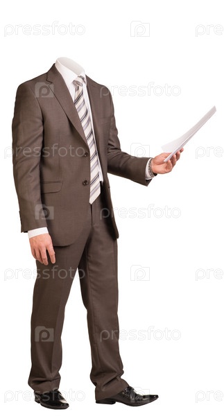 Бизнесмен без головы держит лист бумаги