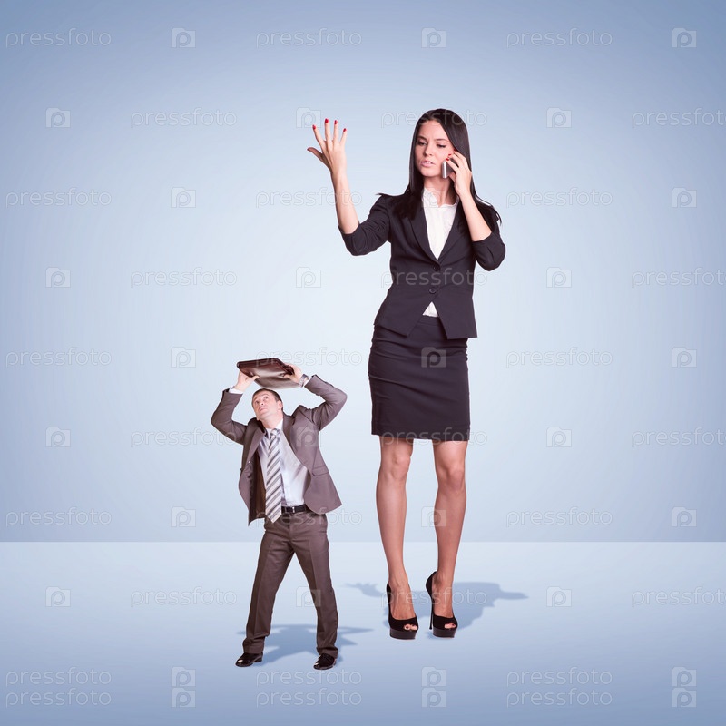 Маленький бизнесмен смотрит на высокую деловую женщину