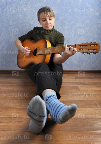 Женщина с гитарой в доме сидит на полу