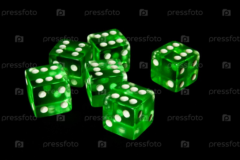 Близкий взгляд на шесть зеленых прозрачных костей на черном фоне