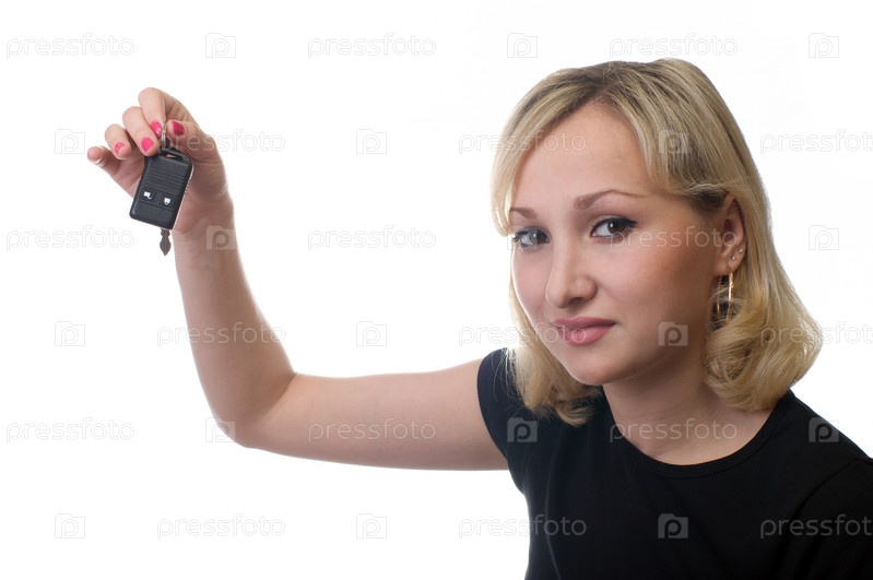 Улыбающаяся девушка хранит ключи от машины, изолирована на белом фоне