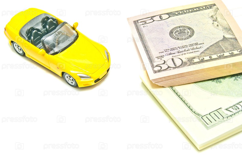 Доллары и желтый автомобиль на белом фоне