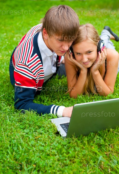 Молодая пара в парке лежит на траве с ноутбуком