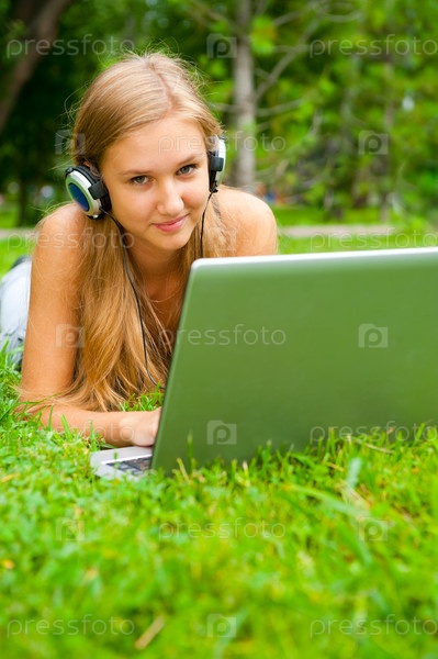 Молодая девушка в наушниках лежит на траве в парке с ноутбуком