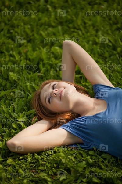 Девушка мечтает, лежа на траве