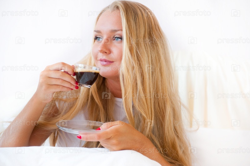 Портрет красивой девушки, которая пьет кофе в кровати