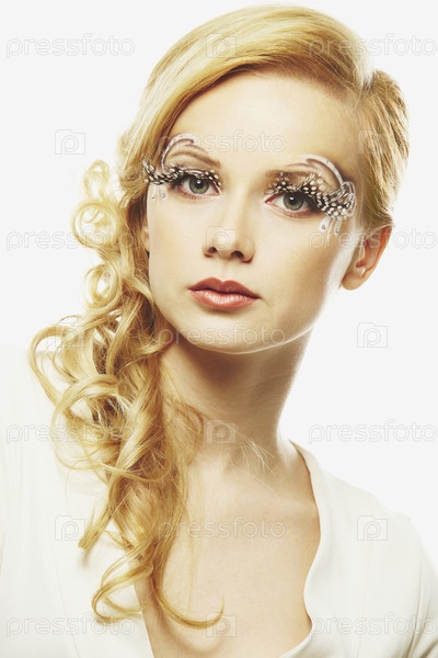 Красивая блондинка с фантазийным макияжем на белом фоне