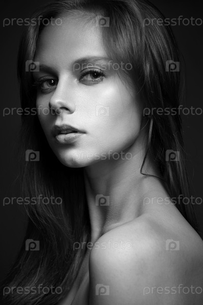 Портрет красивой девушки с длинными волосами, черно-белая фотография
