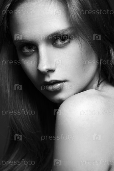 Портрет красивой девушки с длинными волосами, черно-белая фотография