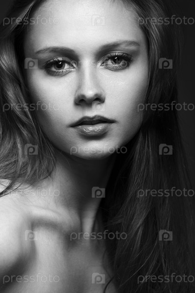 Портрет красивой девушки с длинными волосами, черно-белая фотография