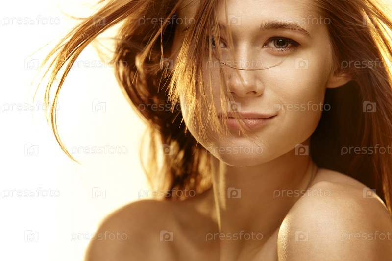 Портрет красивой девушки с развевающимися волосами на белом фоне