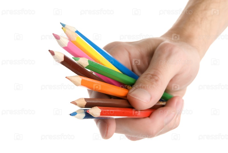 Руки с цветными карандашами над белым