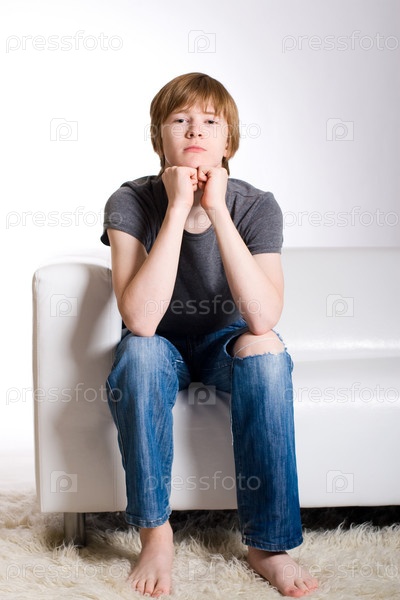 Задумчивый юноша сидит на белом диване