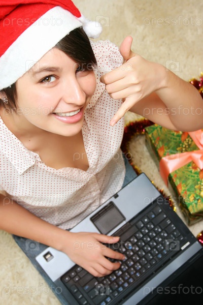 Счастливая улыбающаяся девушка в красной шляпе с ноутбуком