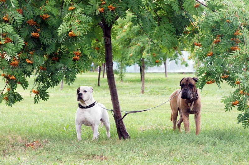 Две собаки, привязанные к дереву в парке