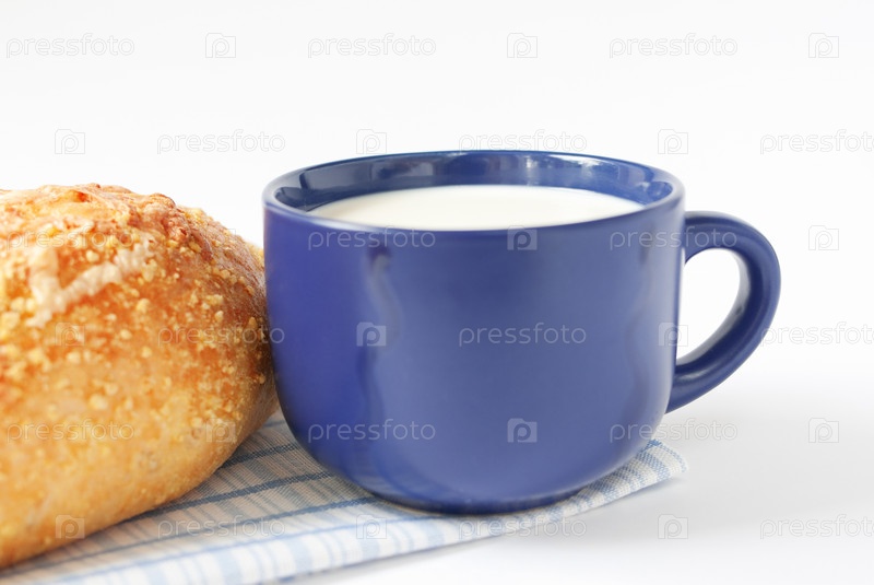 Синяя кружка с молоком и кукурузный хлеб с сыром и семенами подсолнечника