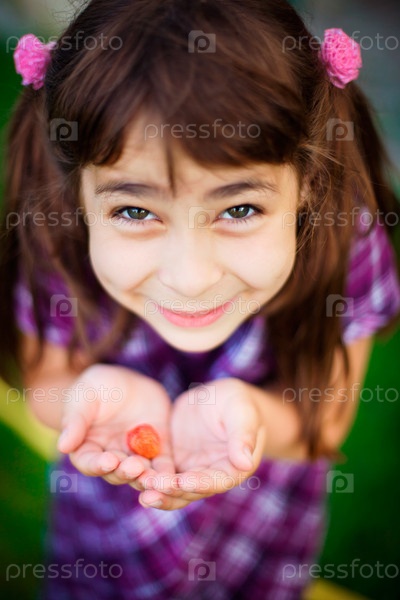 Портрет маленькой красивой девочки с езмляникой на свежем воздухе