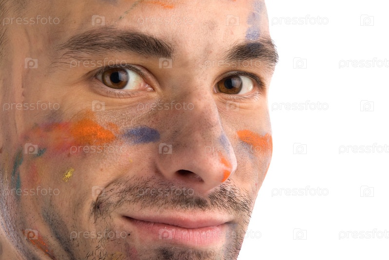 Забавный и какой-то сумасшедший молодой человек с покрашенными руками и лицом