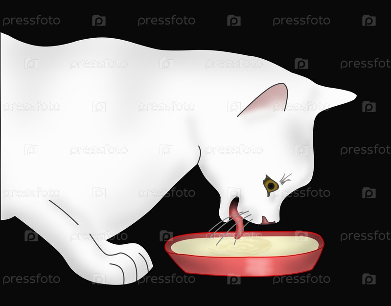 Белая кошка на черном фоне пьет молоко
