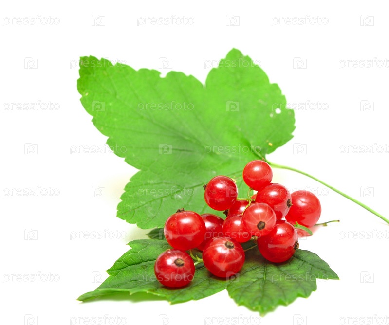 Ягоды красной смородины лежат на зеленых листьях на белом фоне