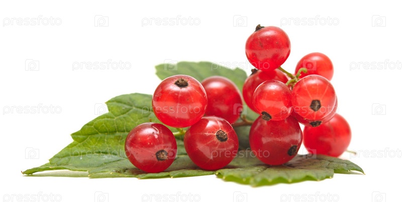 Ягоды красной смородины лежат на зеленых листьях на белом фоне