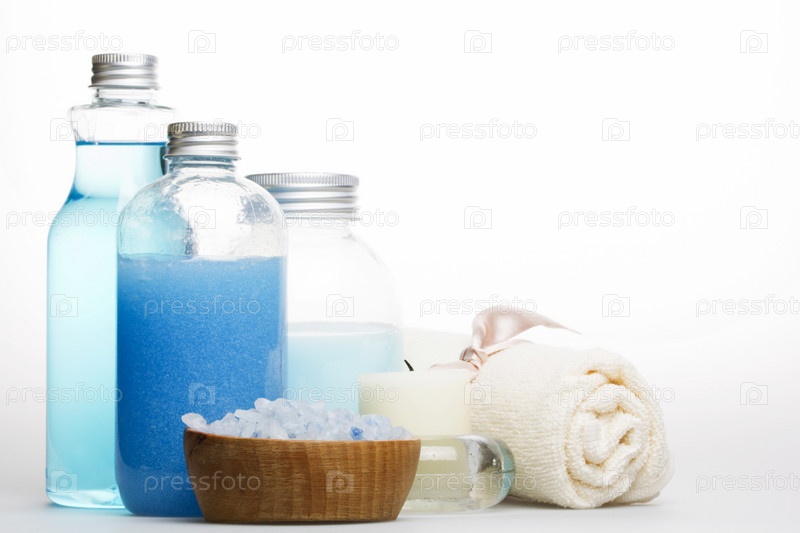 Полотенце, морская ракушка, жидкое мыло, шампунь на светлом фоне