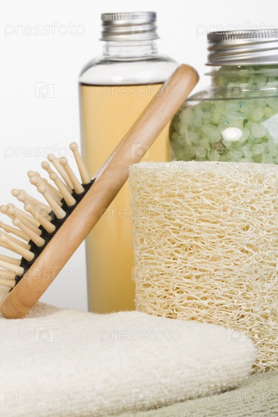 Губка, расческа, соль для ванны, шампунь на светлом фоне
