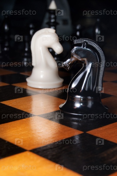 Черный и белый шахматные кони на игровой доске