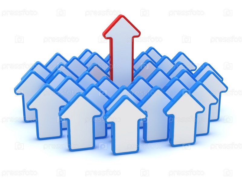 Одна большая красная стрелка в группе маленьких синих стрелок