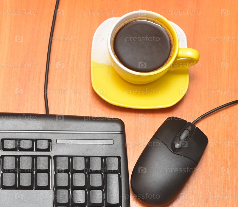 Чашка кофе рядом с клавиатурой и мышью