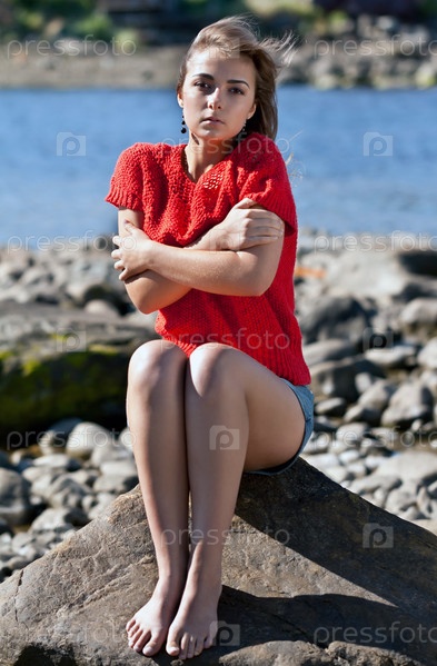 Девушка в красном свитере сидит на камне