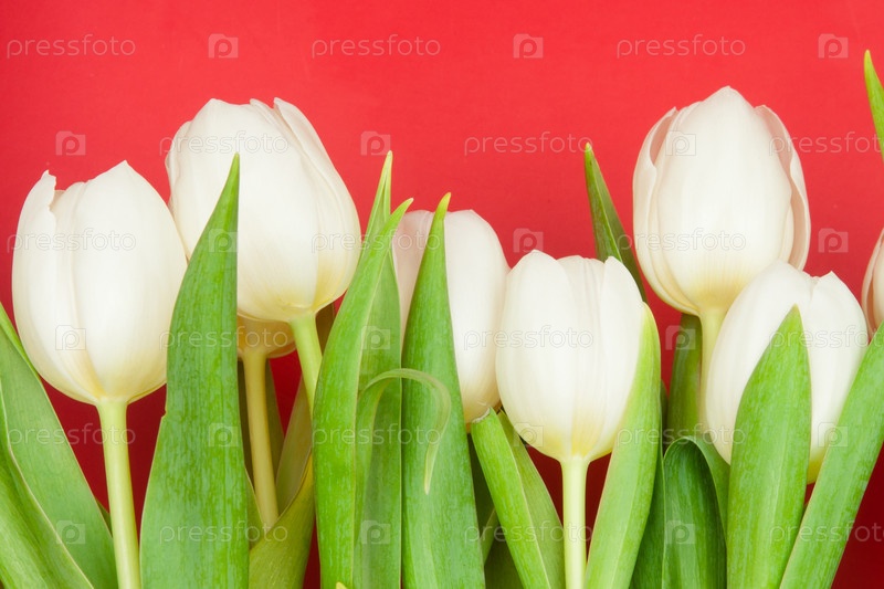 Белые тюльпаны на красном фоне