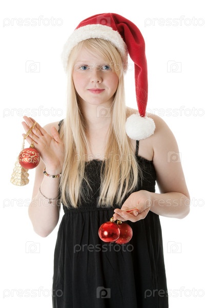 Девушка в новогодней шапке с елочными игрушками в руках